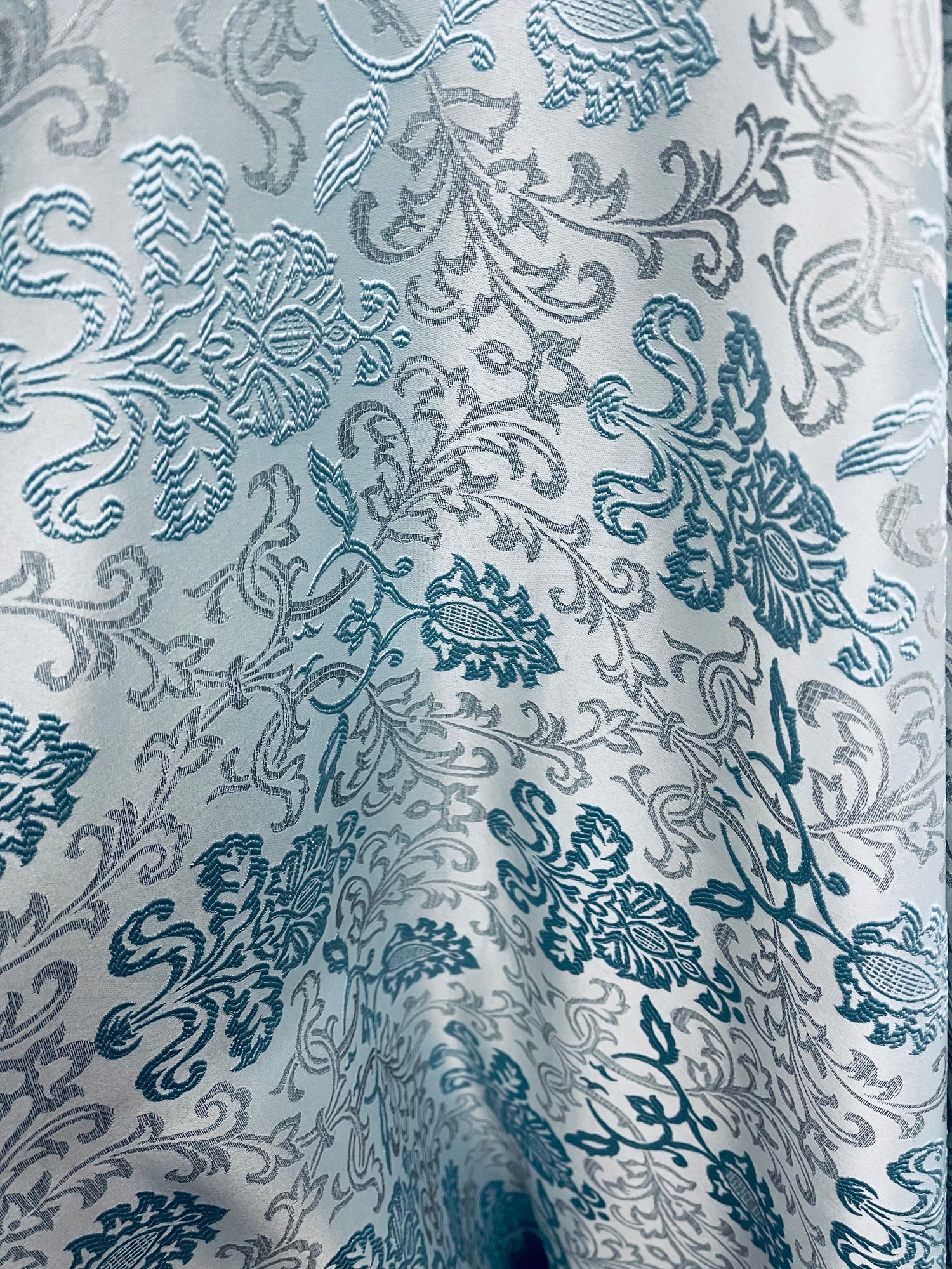 this is luxury mulberry elegant mikado brocade silver with babe blue flowers made in Italy