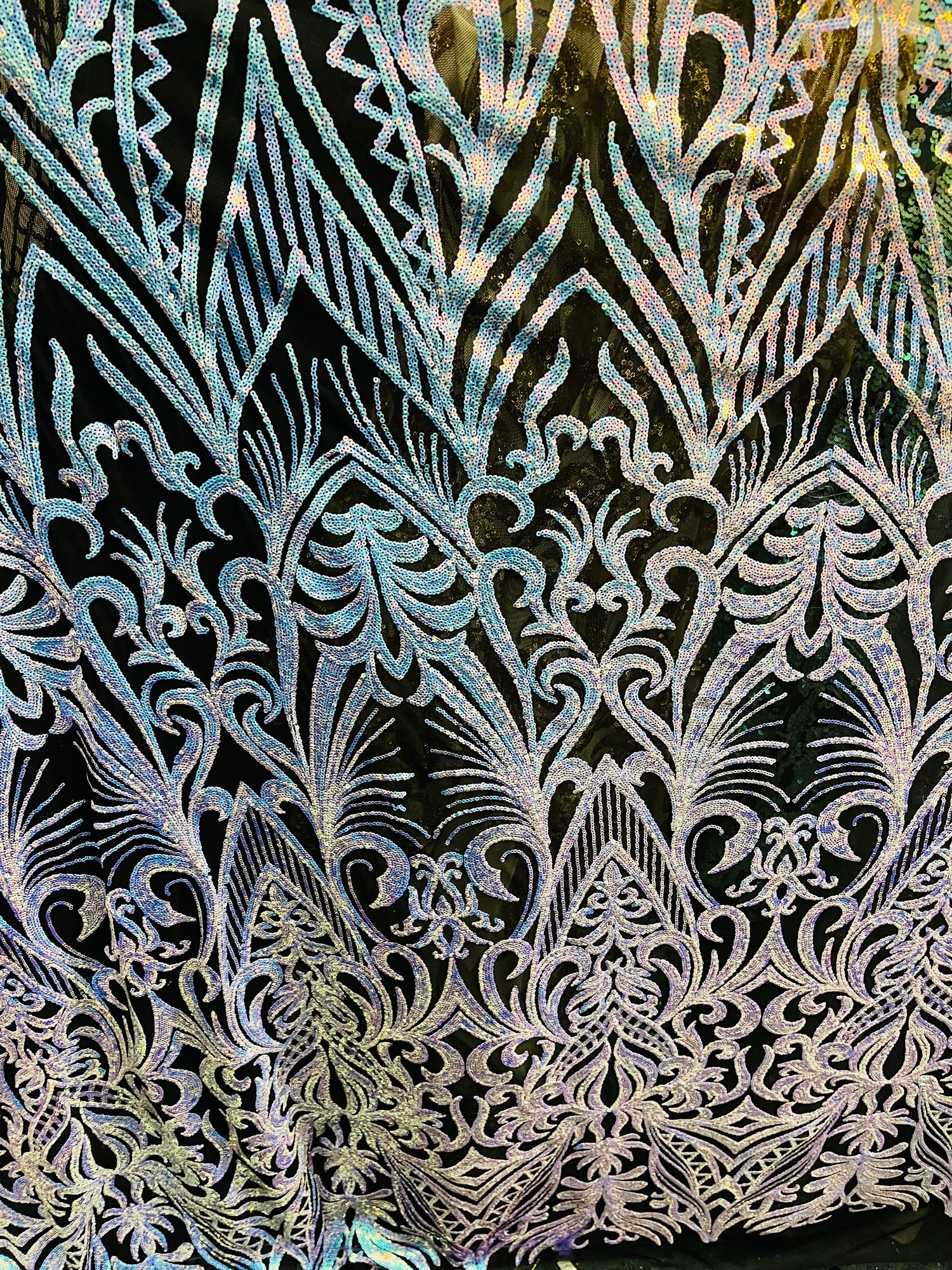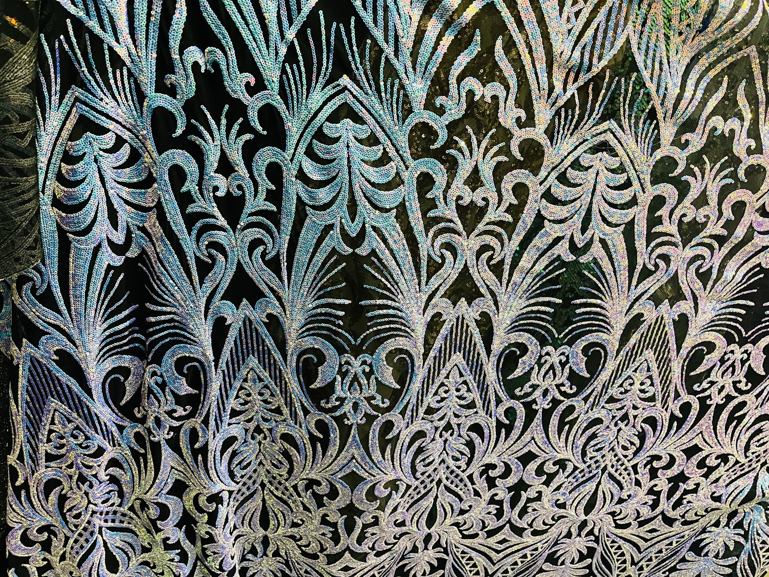 FABRIC; black mesh with purple green multi color sequins 4 WAY LACE sequence